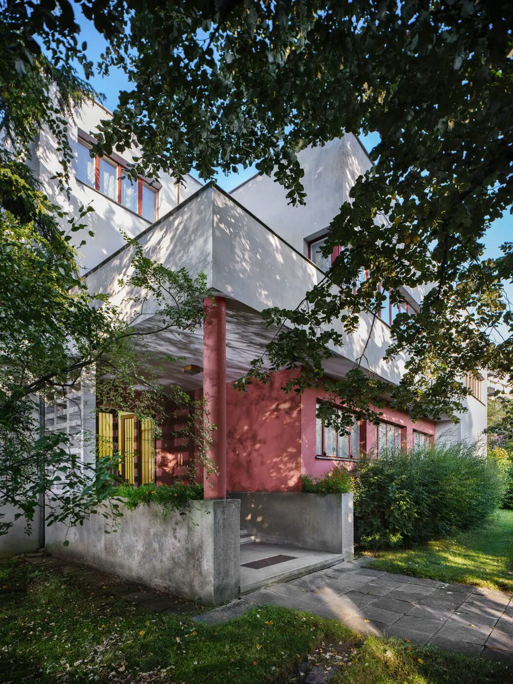 Dům je citlivě zasazen do trojúhelníkového pozemku, kde vytváří iluzi malého veřejného prostranství. Jeho čisté horizontální linie, hladká fasáda, pásová okna, plochá střecha a barevné zvýraznění přízemí odkazují na Gočárovu práci na slavné kolonii Baba v Praze.