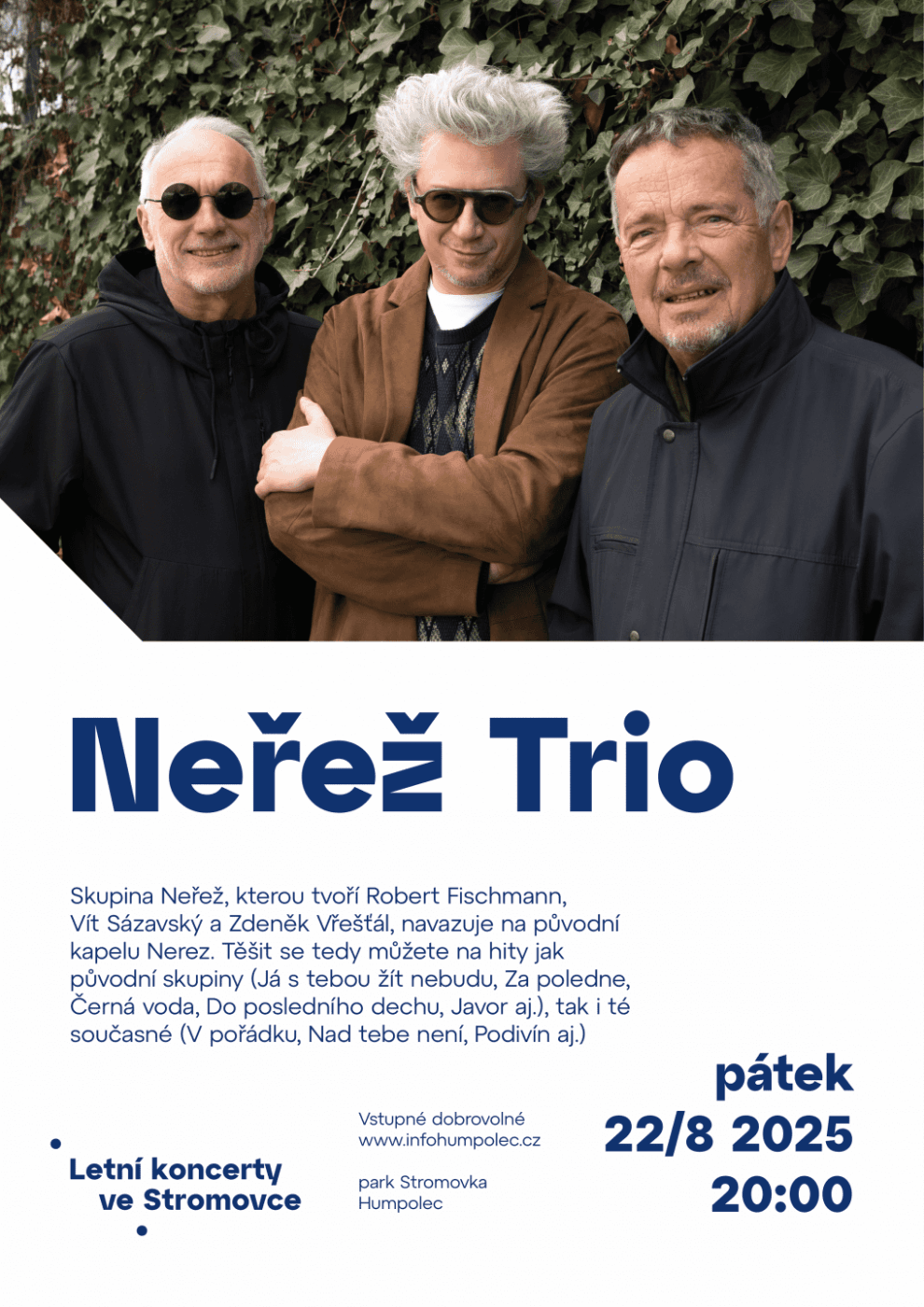 Skupina Neřež, kterou tvoří Robert Fischmann, Vít Sázavský a Zdeněk Vřešťál, navazuje na původní kapelu Nerez. Těšit se tedy můžete na hity jak původní skupiny (Já s tebou žít nebudu, Za poledne, Černá voda, Do posledního dechu, Javor aj.), tak i té současné (V pořádku, Nad tebe není, Podivín aj.)