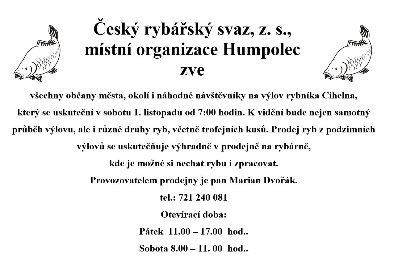 Český rybářský svaz, z. s., místní organizace Humpolec zve všechny občany města, okolí i náhodné návštěvníky na výlov rybníka Cihelna.