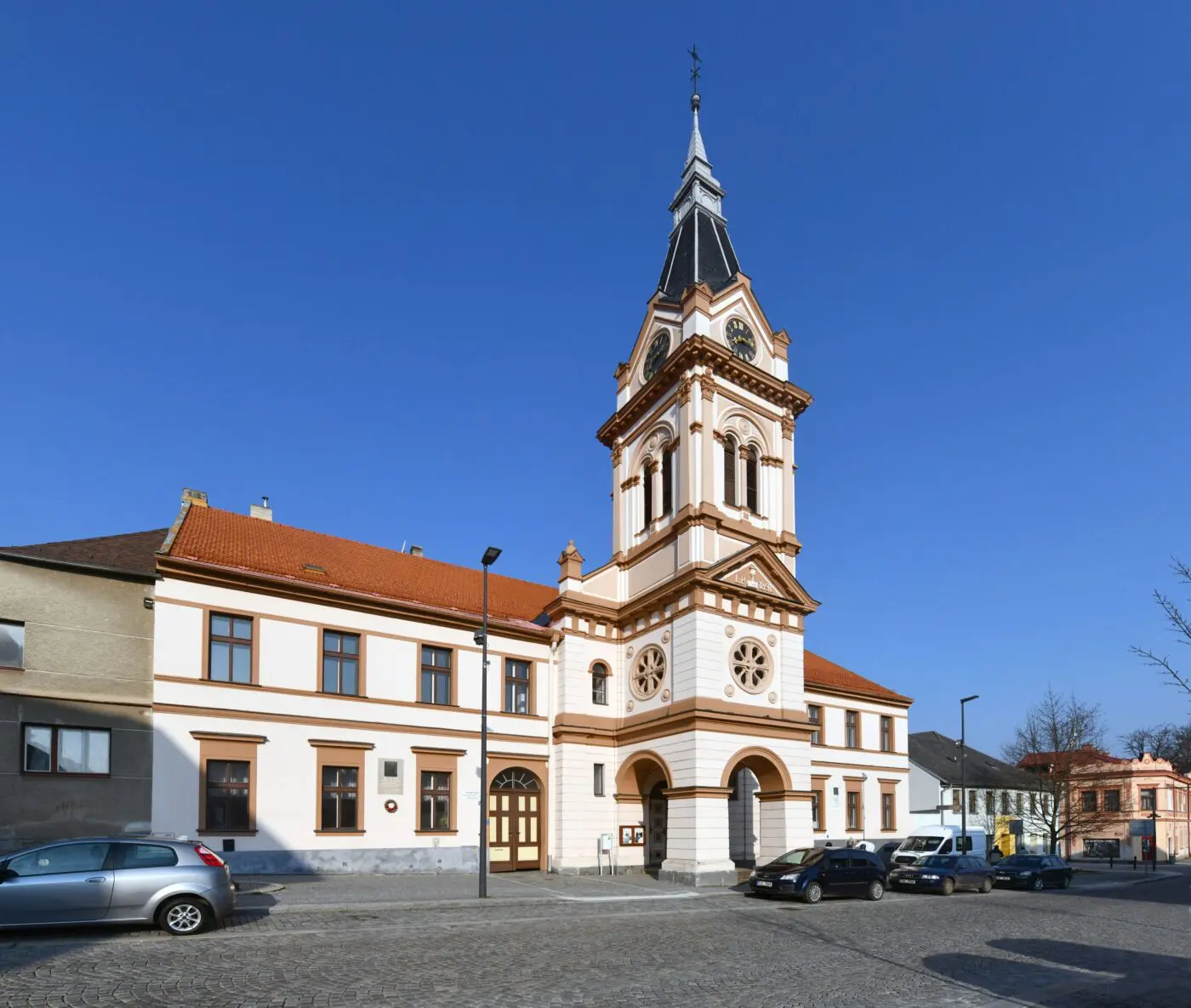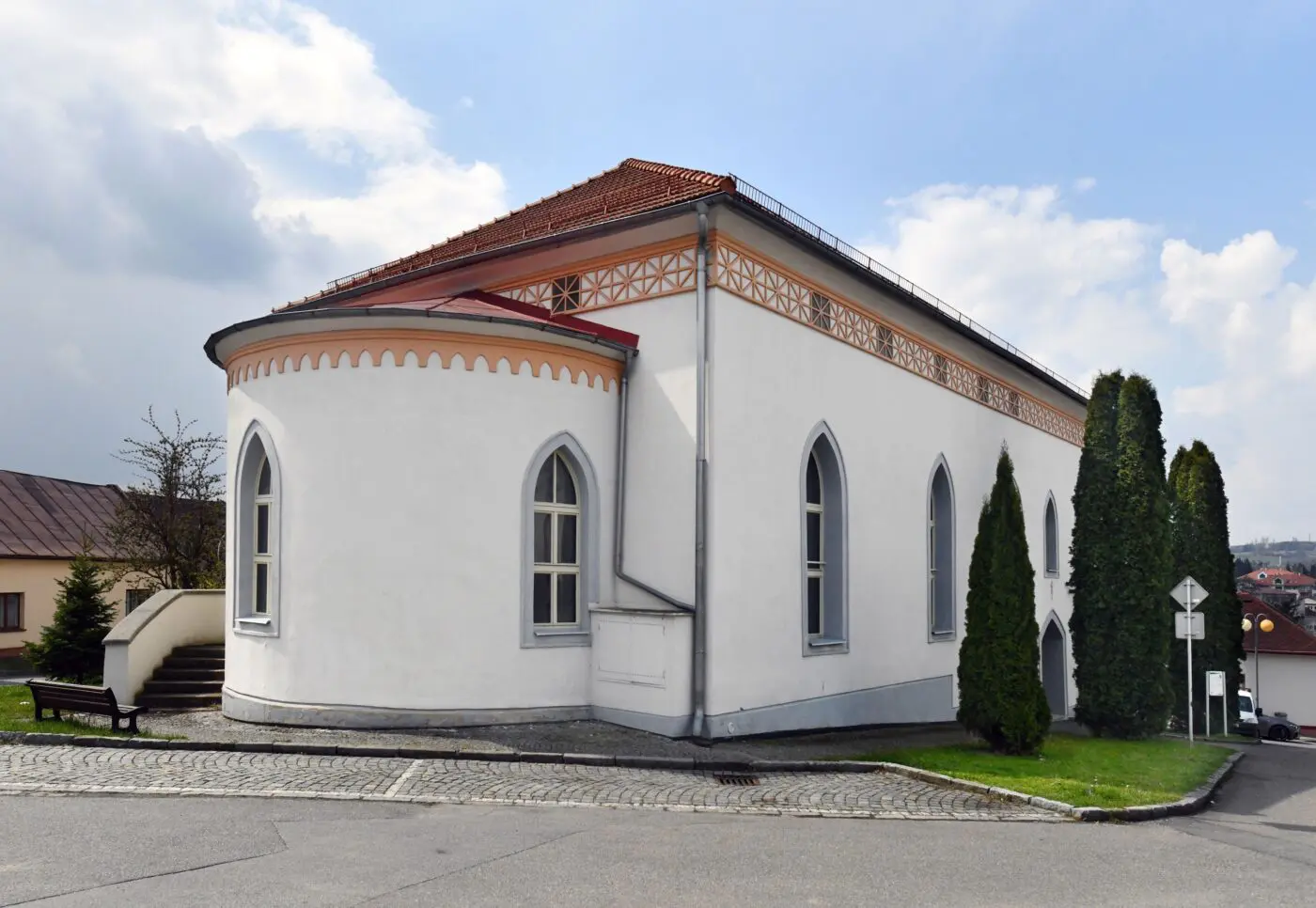 Její stavba probíhala v letech 1760-1762 v barokním slohu, a to na pozemku, který židovské obci prodal tehdejší majitel města. Finance zajistily dary místních i cizích Židů. V 60. letech 19. století došlo k úpravě synagogy v novogotickém stylu. Byla nově vybavena, vyzdobena a doplněna o větší počet sedadel i přístavbu bytu rabína a školy. V roce 1886 vypukl na židovském městě požár, který poničil synagogu a dalších 16 domů. Z uspořádané peněžní sbírky byly tyto objekty obnoveny a k synagoze byla přistavěna apsida. Původnímu účelu sloužila modlitebna až do 40. let 20. století. Po 2. světové válce začala stavba chátrat a využívala se jako sklad či dílny. V roce 1952 ji odkoupila a opravila Církev československá husitská a od počátku 60. let ji začala využívat jako svůj chrám. Ve 21. století došlo k další rekonstrukci, během níž byly objeveny a restaurovány původní barokní malby. U venkovských synagog se jedná o zcela jedinečný objev, který nemá v celé ČR téměř žádného srovnání.