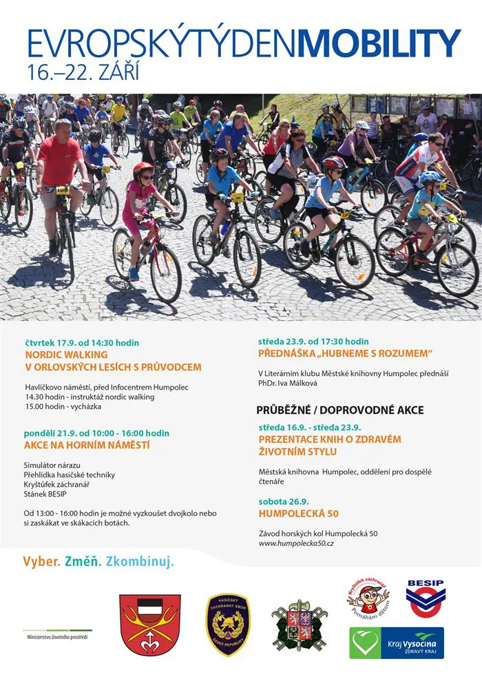 Dne 17. 9. 2015 bude „Evropský týden mobility“ zahájen procházkou do Orlovských lesů, pokračovat bude souborem akcí na náměstí (21. 9. 2015), přednáškou v knihovně (23. 9. 2015), souběžně bude v knihovně prezentace knih o zdravém životním stylu a týden bude ukončen akcí „Humpolecká 50“.