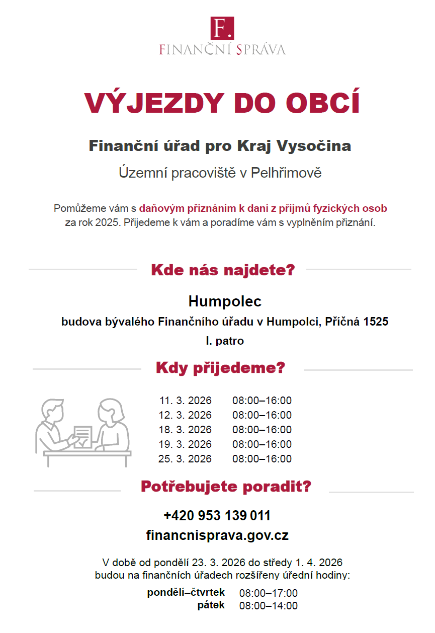 V rámci kampaně k dani z příjmů fyzických osob poskytuje Finanční správa poradenství s vyplněním daňového přiznání včetně jeho podání. Pracovníci Finanční správy poskytnou poradenství v prvním patře budovy bývalého finančního úřadu v Humpolci, v ulici Příčná 1525, v termínech 11., 12., 18., 19. a 25. března vždy od 8 do 16 hodin.