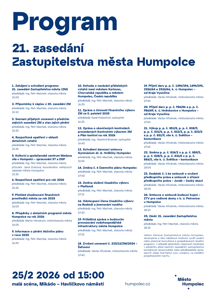Dovolujeme si vás pozvat na 21. zasedání Zastupitelstva města Humpolce, které se uskuteční ve středu 25. února od 15 hodin v Mikádu. Na programu bude například přehled zhodnocení finančních prostředků města za rok 2025, příspěvky z dotačních programů města, informace o plnění Akčního plánu v roce 2025, zpráva kontrolního výboru a také průběžná zpráva o budoucím provozování vodohospodářské infrastruktury.