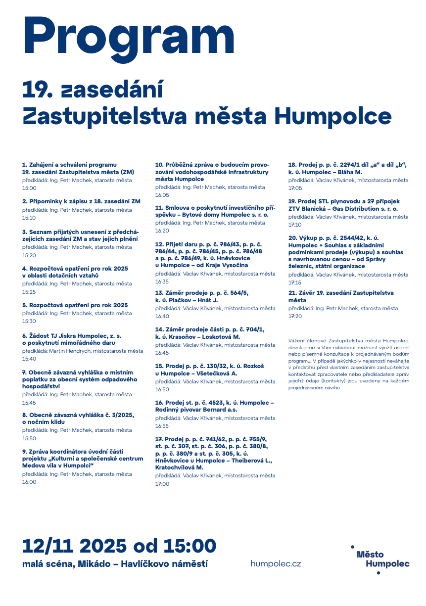 Na programu budou například rozpočtová opatření pro rok 2025, obecně závazná vyhláška o nočním klidu nebo průběžná zpráva o budoucím provozování vodohospodářské infrastruktury v Humpolci.