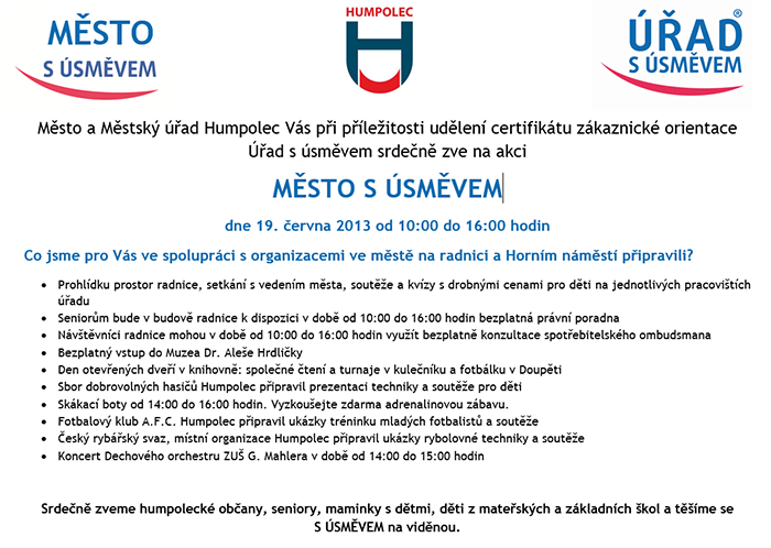 Město a Městský úřad Humpolec Vás při příležitosti udělení certifikátu zákaznické orientace Úřad s úsměvem srdečně zve na akci MĚSTO S ÚSMĚVEM dne 19. června 2013 od 10:00 do 16:00 hodin
