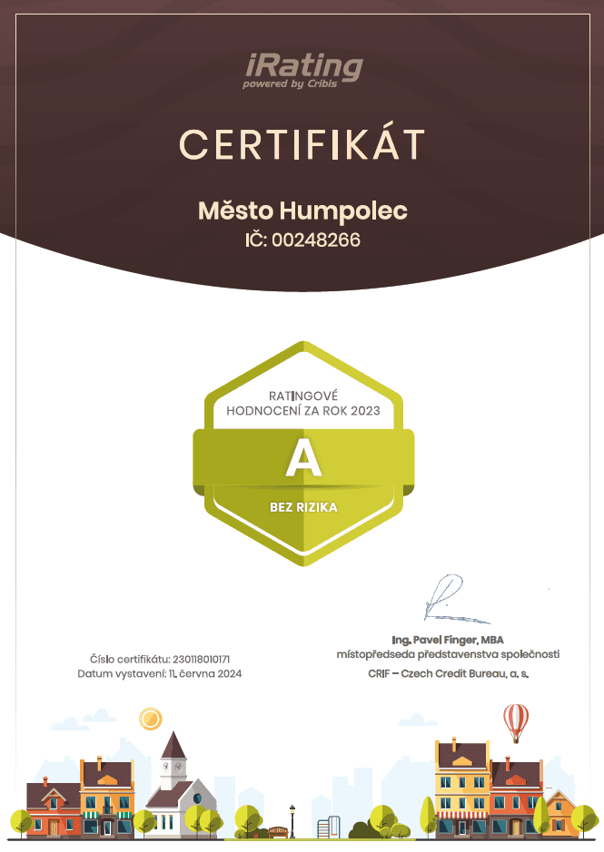 Společnost CRIF – Czech Credit Bureau, a. s. ohodnotila hospodaření města Humpolec za rok 2023 nejvyšším iRatingovým stupněm „A“ a udělila městu čestný Certifikát. Stupeň „A“ vypovídá o vynikající finanční stabilitě ekonomických ukazatelů, které velmi výrazně převyšují ukazatele obcí se srovnatelným počtem obyvatel. Podle analýz společnosti CRIF Czech Credit Bureau, a. s. navíc okolní prostředí i ekonomické podmínky regionu dávají velmi dobré předpoklady dalšího rozvoje.
