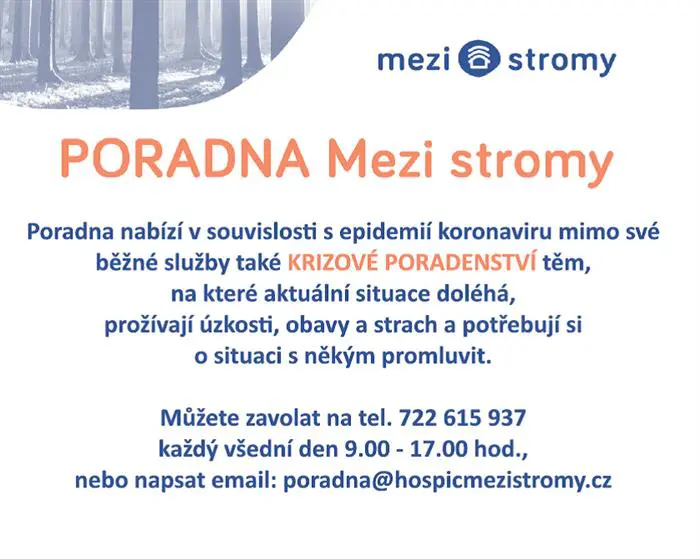 Poradna Mezi stromy nabízí v souvislosti s epidemií koronaviru mimo své běžné služby také krizové poradenství těm, na které aktuální situace doléhá, prožívají úzkost, strach a potřebují si s někým promluvit. Telefonní číslo 722615937 je k dispozici každý všední den od 9 do 17 hodin, případně lze napsat e-mail na poradna@hospicmezistromy.cz. Poradnu Mezi stromy finančně podporuje i město Humpolec.