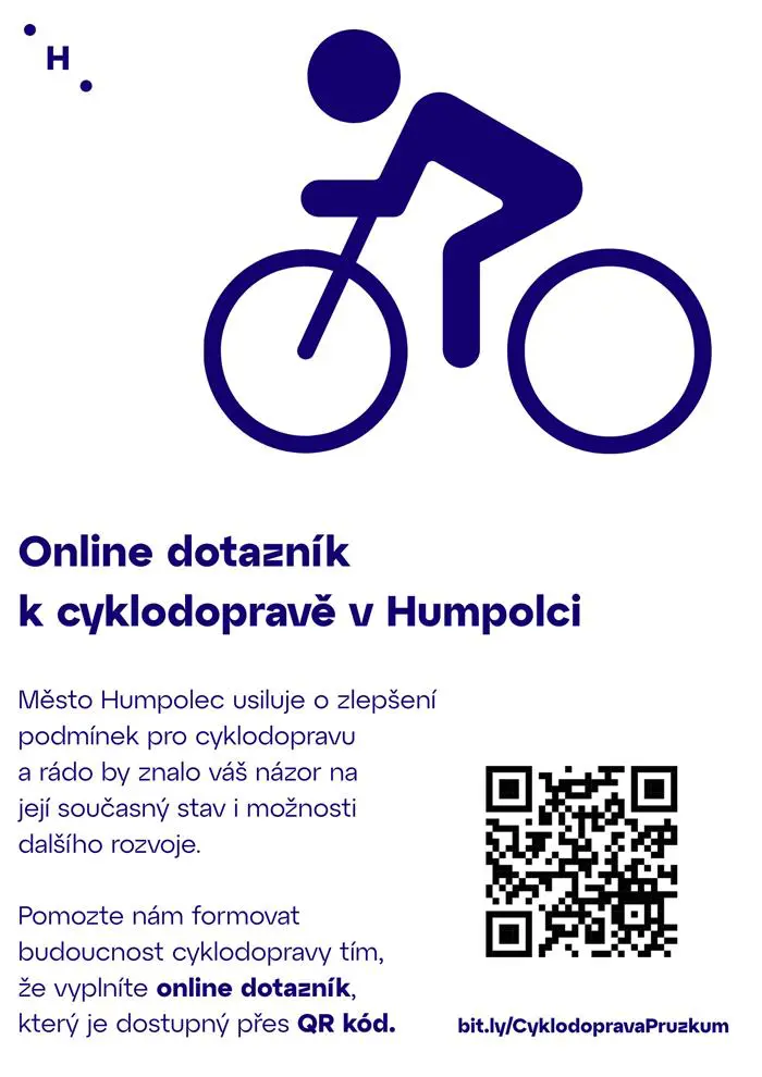 Vážení občané, město Humpolec usiluje o zlepšení podmínek pro cyklodopravu. Rádi bychom znali váš názor na její současný stav i možnosti dalšího rozvoje. Zajímají nás vaše zkušenosti, potřeby a také váš pohled na případné zavedení systému sdílených kol. Pomozte nám formovat budoucnost cyklodopravy tím, že vyplníte online dotazník, který je dostupný na adrese bit.ly/CyklodopravaPruzkum a přes QR kód.