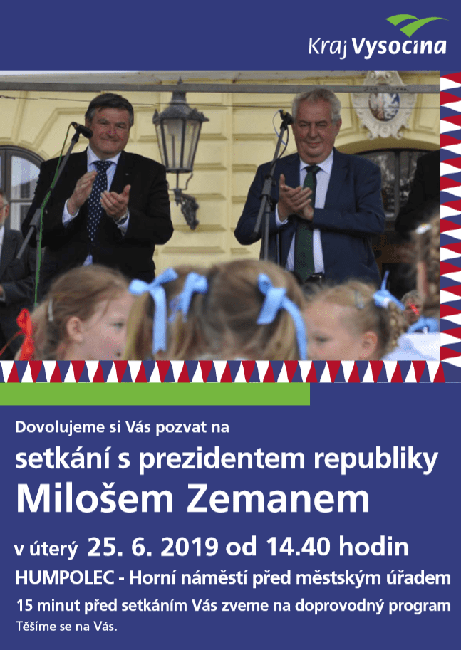 Prezident České republiky Miloš Zeman zavítá v úterý 25. června 2019 na oficiální návštěvu Humpolce. V rámci svého programu se nejdříve setká s představiteli města Humpolce v budově radnice. Setkání s občany je pak naplánováno na Horním náměstí ve 14:40 hodin. Zhruba patnáct minut předem přijde na řadu doprovodný program v režii Dechového orchestru mladých ZUŠ Gustava Mahlera v Humpolci.