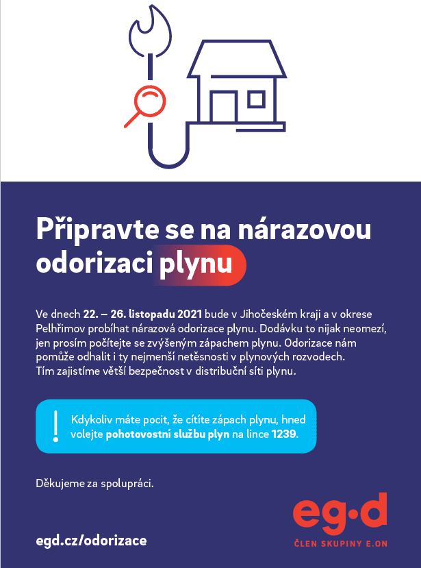 Sdílíme informaci od společnosti EG.D: Ve dnech 22. až 26. listopadu 2021 bude v Jihočeském kraji a v okrese Pelhřimov probíhat nárazová odorizace plynu. Dodávku to nijak neomezí, jen prosím počítejte se zvýšeným zápachem plynu. Odorizace pomůže odhalit i nejmenší netěsnosti v plynových rozvodech a zajistit větší bezpečnost v distribuční síti plynu.