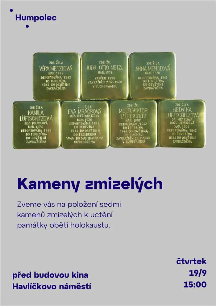 V Humpolci se ve čtvrtek 19. září od 15 hodin uskuteční u budovy kina pietní položení kamenů zmizelých – Stolpersteine.