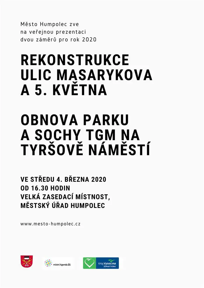 Největší plánovanou investicí města Humpolec pro rok 2020 je rekonstrukce Masarykovy ulice. Dalším zajímavým záměrem je úprava parku na Tyršově náměstí, která zahrne i obnovu sochy Tomáše G. Masaryka. Mimochodem, obnova sochy je pomyslným malým dárkem k letošnímu 170. výročí narození prvního prezidenta. Informace k oběma akcím přinesou nejen únorové Radniční listy, ale také veřejná prezentace, na kterou srdečně zveme všechny zájemce.