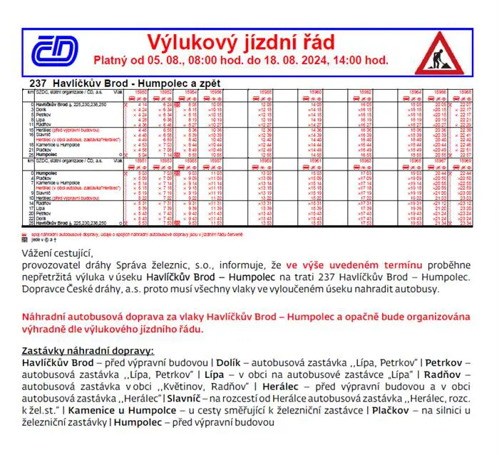 Správa železnic, s. o., informuje, že v termínu od 5. srpna (od 8:00) do 18. srpna (14:00) se uskuteční nepřetržitá výluka na trati 237 v úseku Havlíčkův Brod–Humpolec. Dopravce České dráhy, a. s. všechny vlakové spoje ve vyloučeném úseku nahradí autobusy.