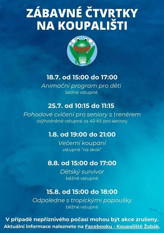 Konání akcí je vždy závislé na počasí. Program může být změněn či zrušen. V případě nepříznivého počasí mohou být akce zrušeny. Pro aktuální informace sledujte facebookovou stránku koupaliště Žabák.